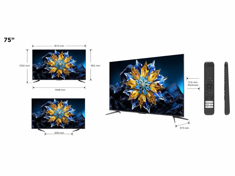 De TCL 75C655 heeft een slank ontwerp met een dunne bezel, waardoor hij een moderne uitstraling heeft die naadloos in uw interieur past. Met de afmetingen van 166,6 cm breed, 95,8 cm hoog en 7,5 cm diep zonder voet, is de tv geschikt voor wandmontage of plaatsing op een tv-meubel.