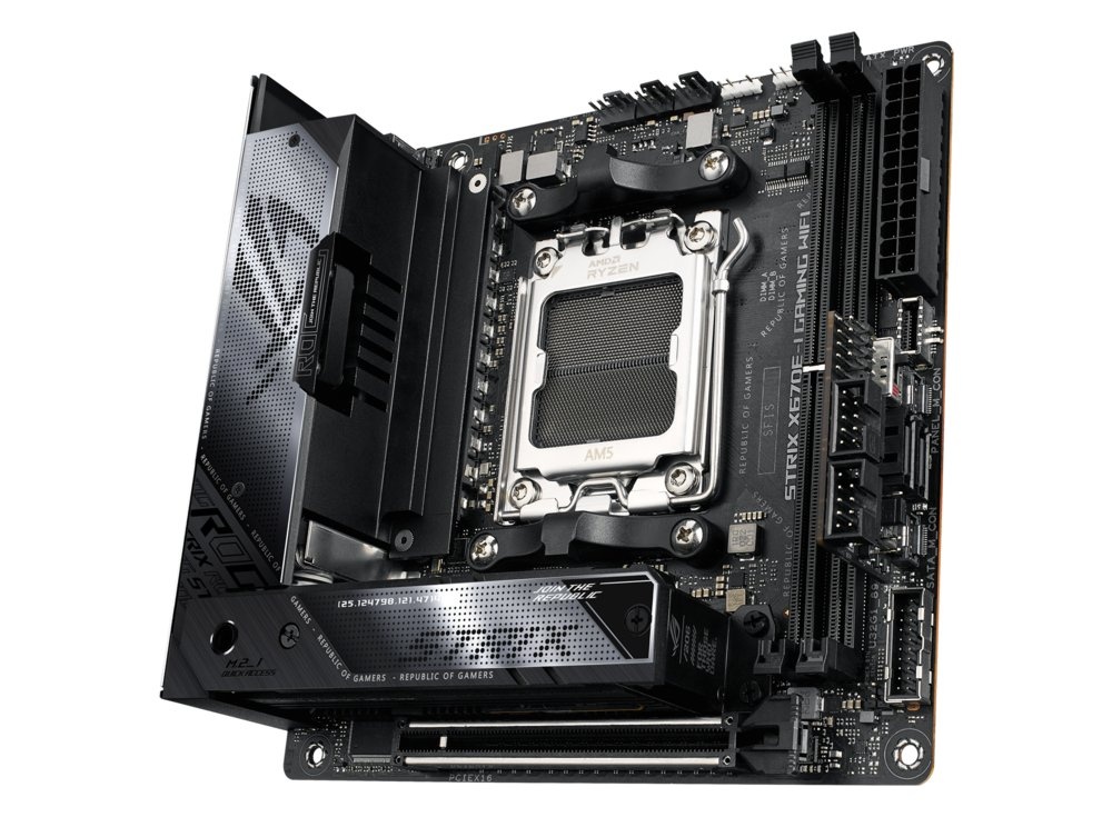 ASUS ROG STRIX X670E-I GAMING WIFI. Processorfabrikant: AMD, Processor socket: Socket AM5. Ondersteunde geheugen types: DDR5-SDRAM, Maximum intern geheugen: 64 GB, Geheugen slots type: DIMM. Ondersteunde opslagstationinterfaces: M.2, SATA III, Ondersteunde types opslag-drives: HDD & SSD. Maximum resolutie: 3840 x 2160 Pixels. Ethernet interface type: 2.5 Gigabit Ethernet, Fast Ethernet, Gigabit Ethernet, LAN controller: Intel I225-V, Wifi-standaard: Wi-Fi 6E (802.11ax)