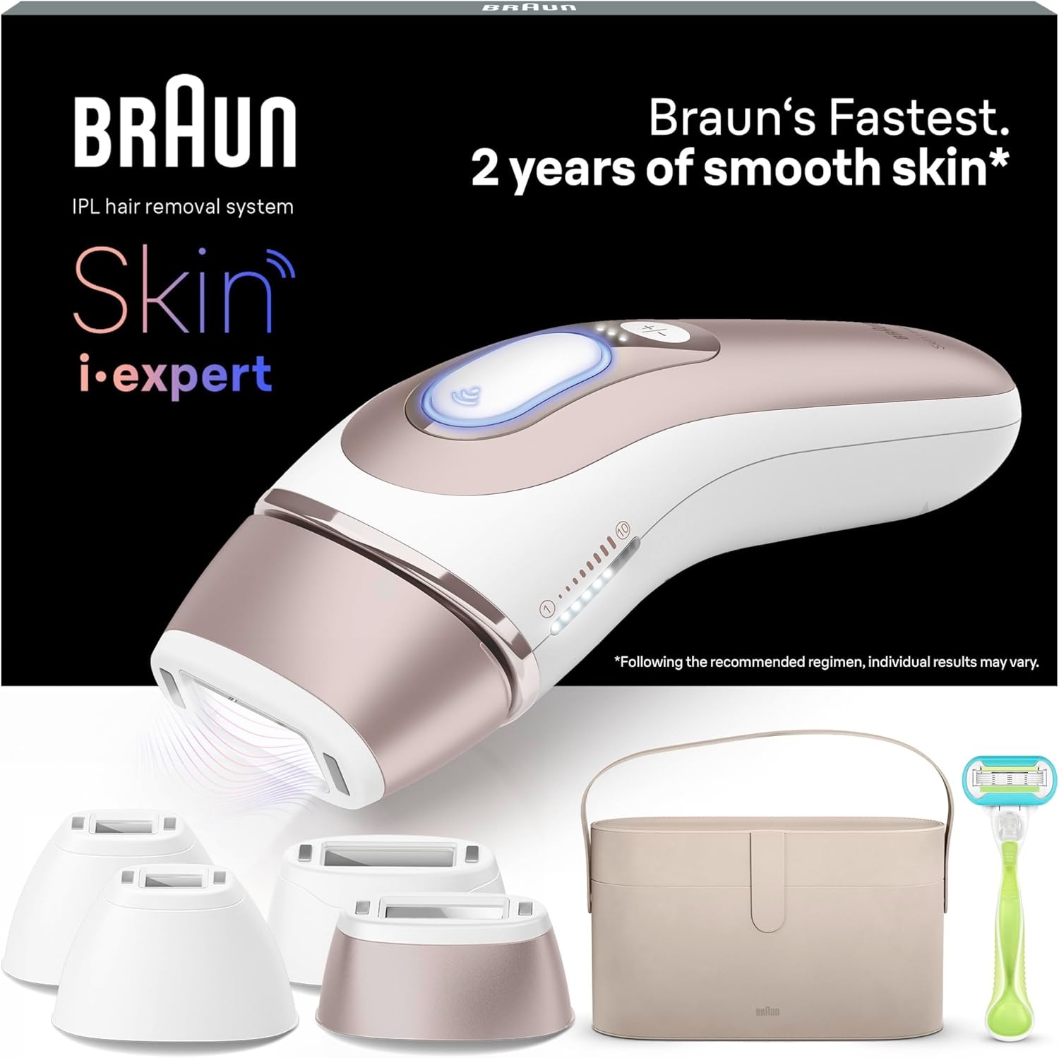 Braun Smart IPL Skin i-expert PL7387 met automatische huidtoonaanpassing, app-begeleiding, 4 opzetstukken, Venus-scheermes en etui voor langdurig gladde huid thuis.