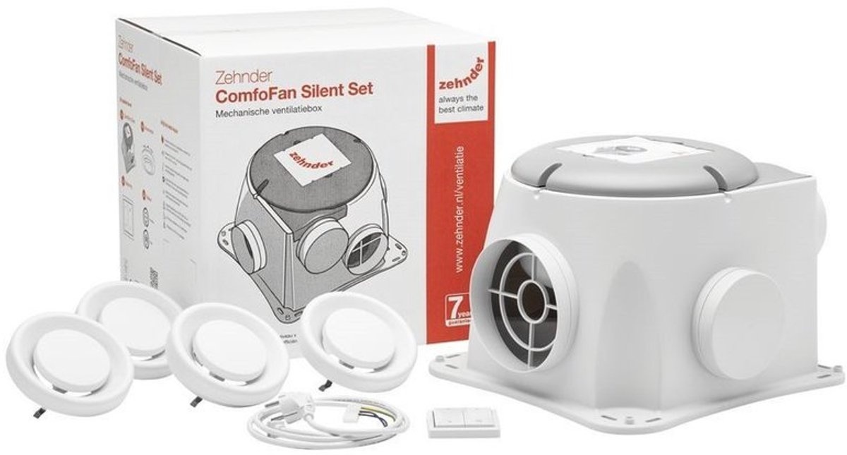 Compleet Zehnder ComfoFan Silent alles-in-1 pakket met stille ventilatiebox tot ca. 425 m³/h, geïntegreerde vochtsensor, RF-afstandsbediening, Euro- én Perilexstekker en 4 ventielen. Ideaal voor vraaggestuurde mechanische ventilatie.