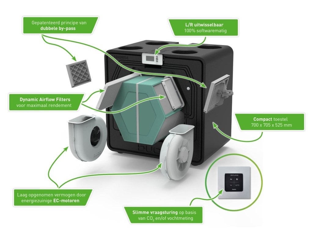 - Warmteterugwinning voor een energiezuinig en comfortabel ventilatiesysteem.