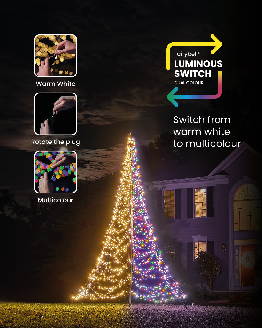Cre‘er in een handomdraai de perfecte sfeer met de Fairybell Luminous Switch 4 meter Ð 1500 LED-lampjes. Deze compacte, luxe lichtmast biedt het beste van twee werelden: warm wit en koel wit licht in een systeem. Dankzij de slimme Luminous Switch-functie wissel je eenvoudig van kleur, zodat je voor elke gelegenheid de juiste uitstraling hebt Ð van warme kerstgloed tot heldere winterpracht.