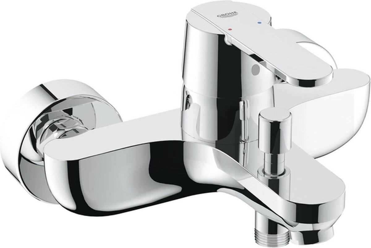 Robuuste GROHE Get eengreeps badmengkraan met omsteller. Wandmontage, SilkMove 46 mm cartouche, instelbare debietbegrenzer, 1/2" douche-uitgang met terugslagklep, S-koppelingen, mousseur en LongLife chroomafwerking. Inclusief rozetten. EAN 4005176878824.