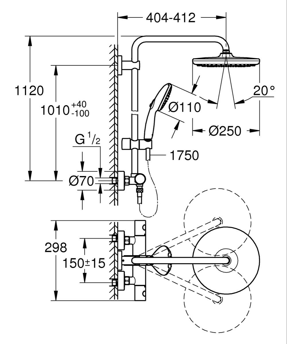 | Brusestang / arm | Vaste buis met ca. 390 mm draaibare douchearm voor optimale positionering van de hoofddouche |