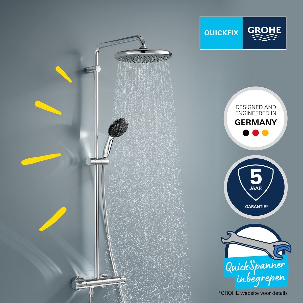 GROHE Vitalio Start System 250 regendoucheset met 250 mm hoofddouche, 110 mm handdouche en thermostaatkraan. Comfortabele regenstraal, veilige watertemperatuur en QuickFix-montage voor renovatie.
