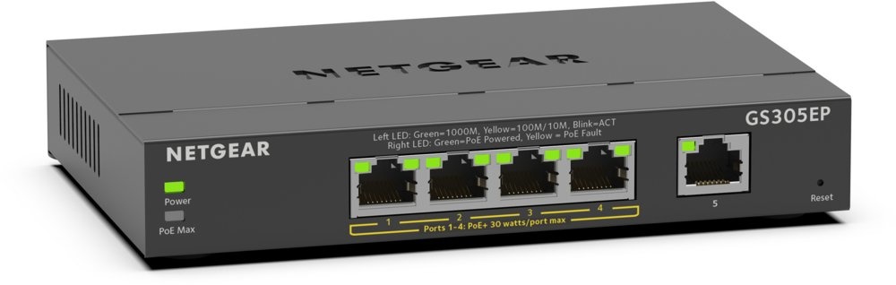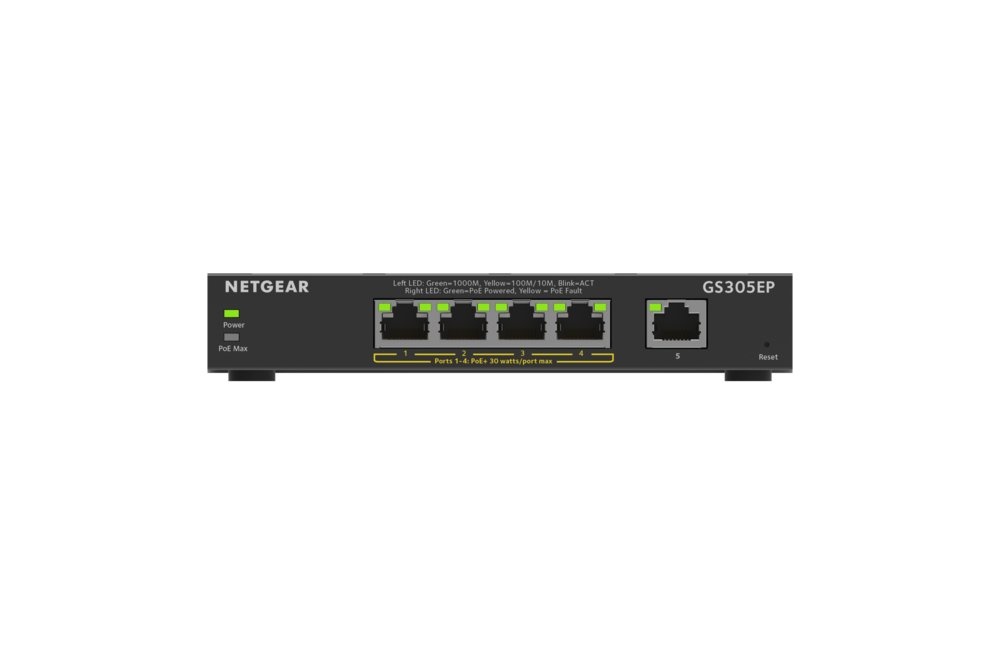 Introductie van de NETGEAR GS305EP PoE + Gigabit Ethernet Smart Managed Plus Switch met 4 PoE + poorten en een totaal PoE budget van 63W om PoE-toepassingen zoals VoIP-telefoons, IP-surveillancecamera's, draadloze toegangspunten en meer van stroom te voorzien.