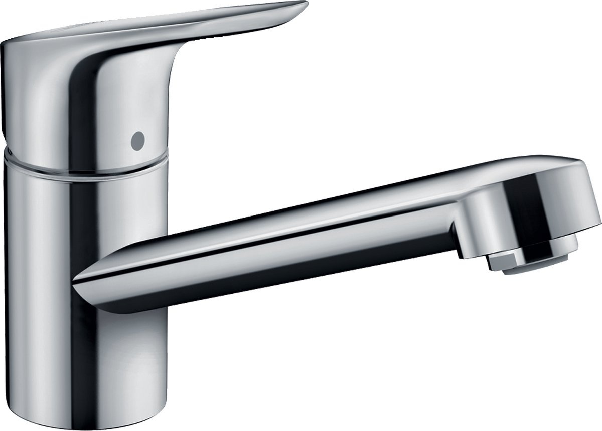 Hansgrohe Focus 1-gats: 360¡ draaibare uitloop, soepele bediening en duurzame chroomafwerking. Compact en praktisch voor elke keuken.