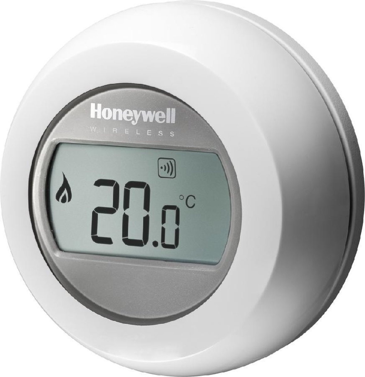 Honeywell Round Wireless (T87RF2025) – draadloze kamerthermostaat met intuïtieve draaiknop en digitaal display. Werkt op batterijen en geschikt voor aan/uit‑ketels.