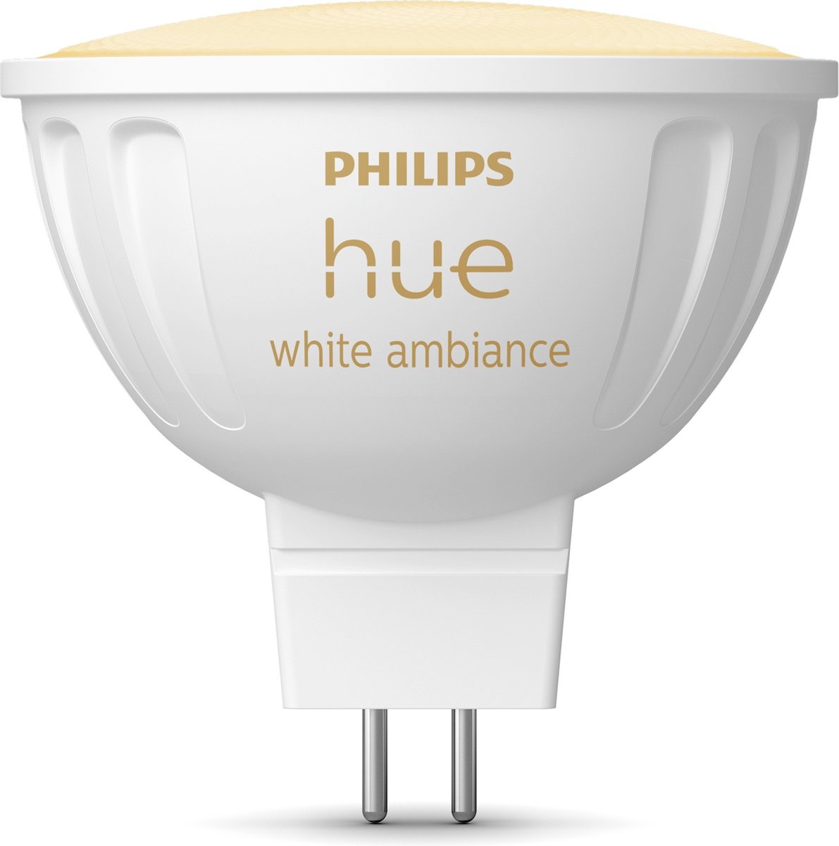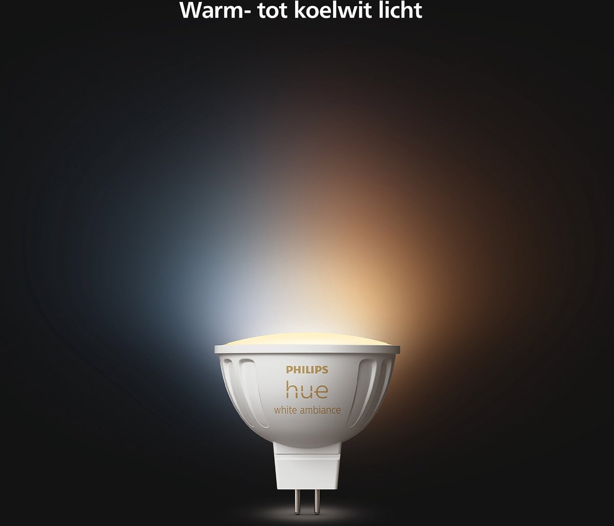 Philips Hue MR16 White Ambiance is een slimme 12V-spot met instelbaar witlicht, van warm tot koel. Dimbaar, geschikt voor bestaande MR16-armaturen en via Hue Bridge te bedienen met app, scènes, timers en spraak.