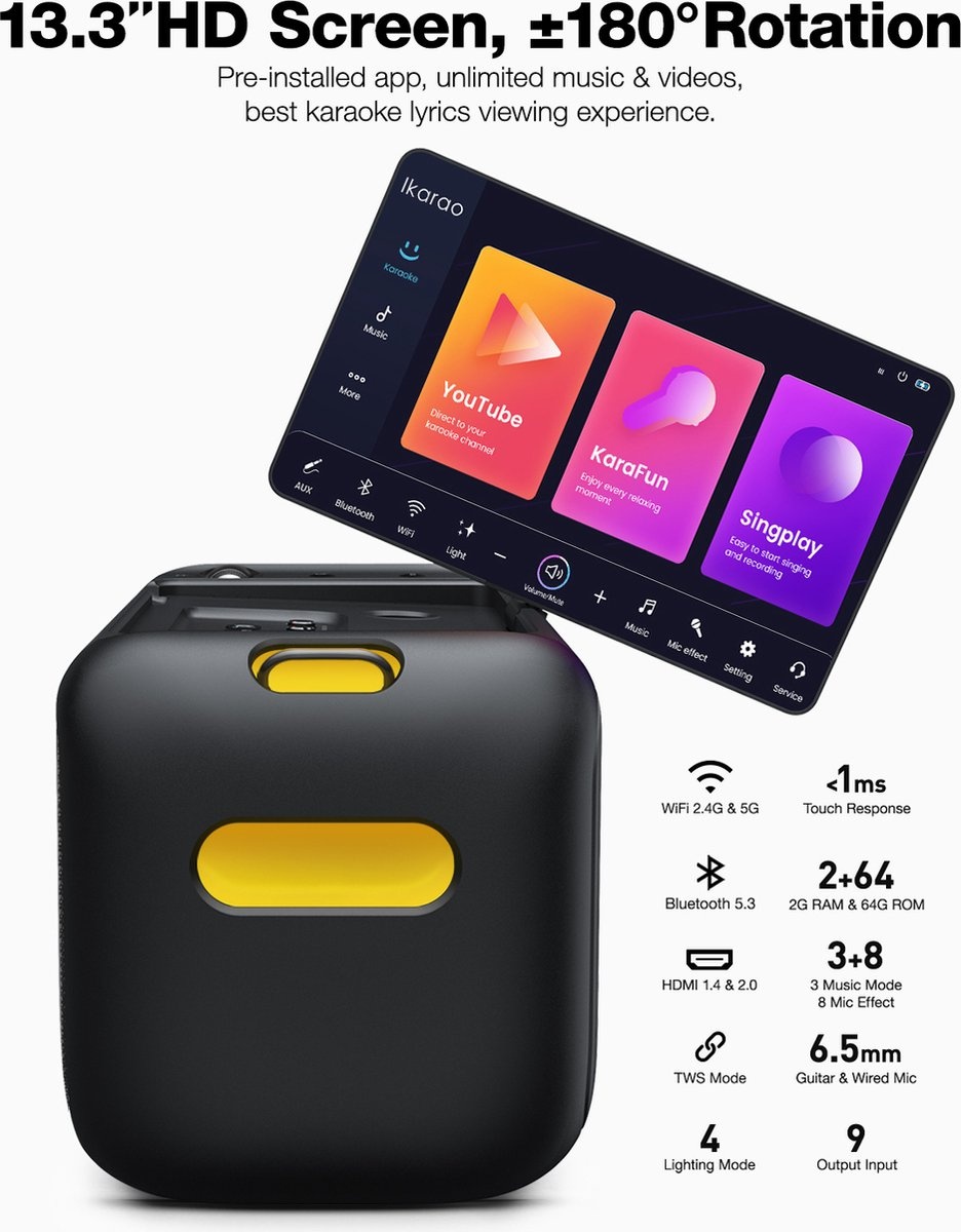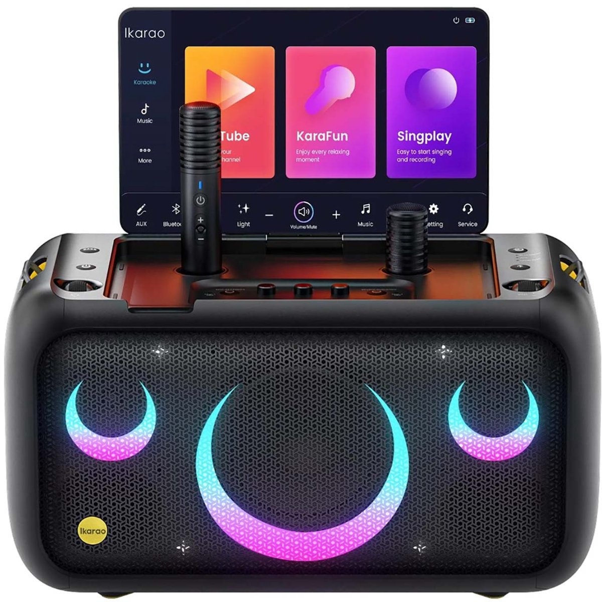 De Ikarao Break X1 is een krachtige draagbare karaoke speaker met dynamische lichtshow, meerdere ingangen en lange accuduur. Perfect voor feestjes, huiselijke karaoke-avonden en presentaties, met helder geluid en eenvoudig bedieningspaneel.