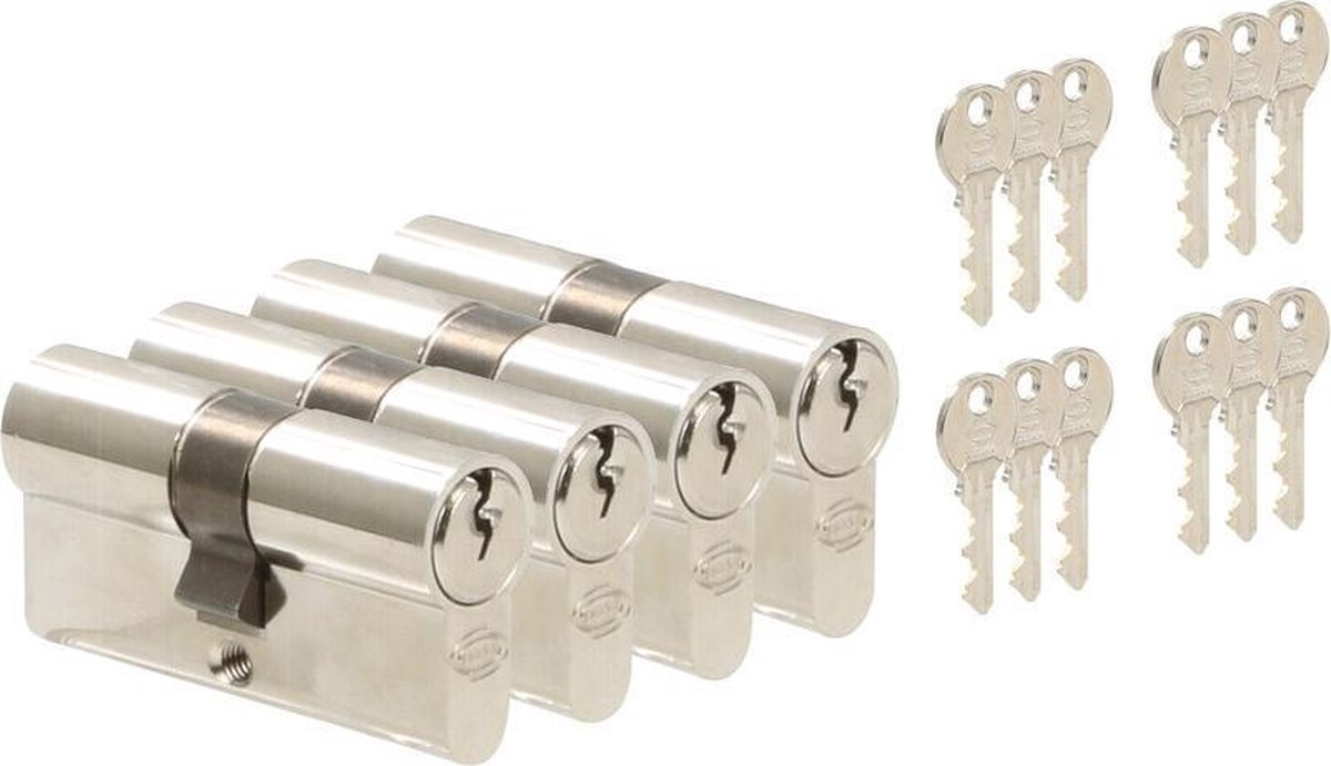NEMEF profielcilinderset 30/30 mm messing glans Ð 4 gelijksluitende cilinders met 12 sleutels. Eenvoudig, duurzaam en perfect voor meerdere deuren.