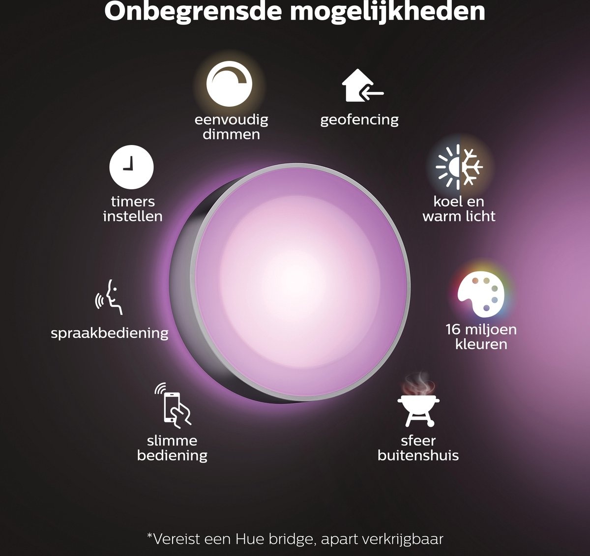 - Slimme bediening via Hue app, scènes, routines en spraak (via Bridge)
