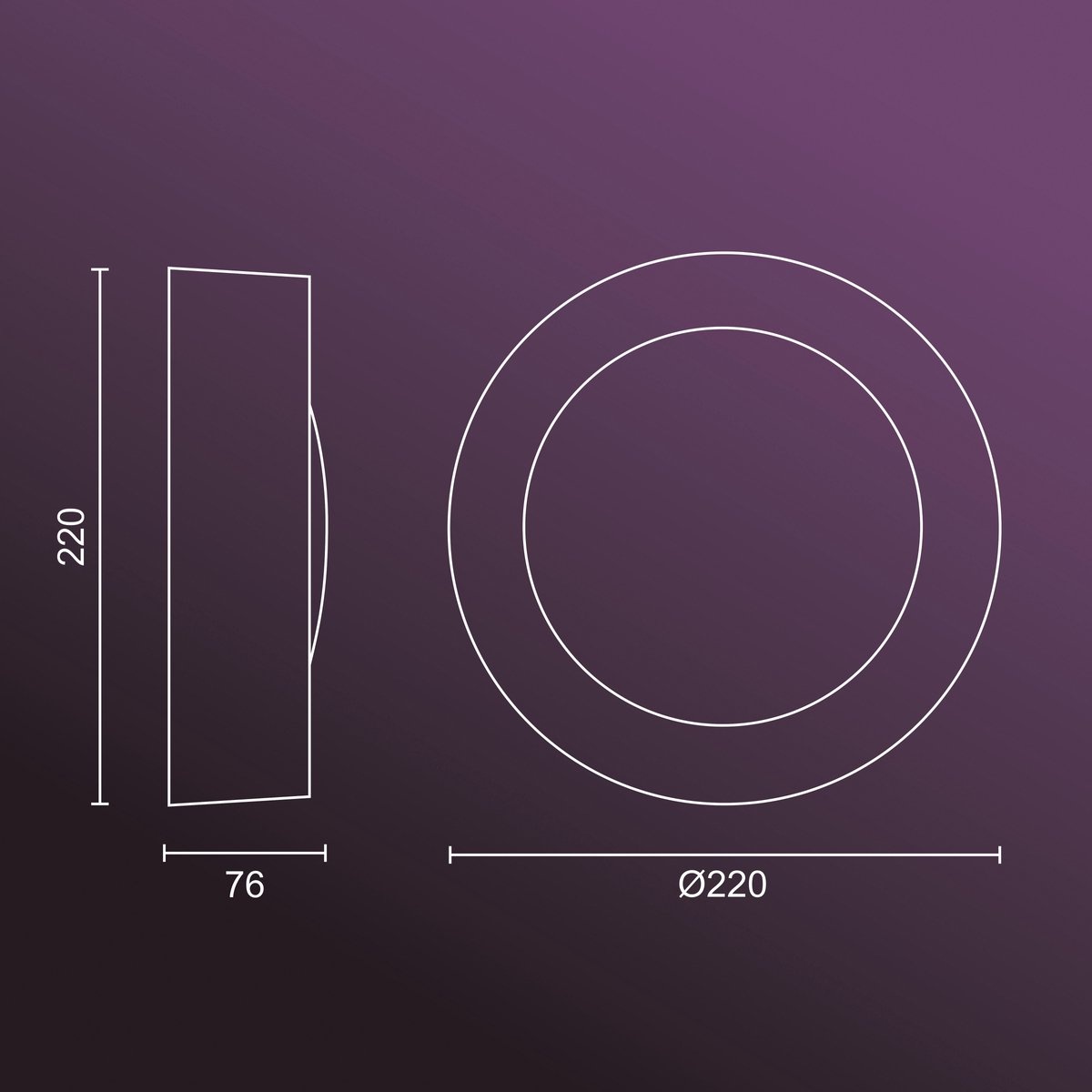 Ronde Hue buitenwandlamp met 16M kleuren, 1050 lm, 15 W en 2000–6500 K. IP44, netspanning 220–240 V en Zigbee (Hue Bridge vereist). Aluminium afwerking, Ø 22 cm, diepte 7,6 cm. Compleet met geïntegreerde LED en montagemateriaal. EAN 8718696174418.