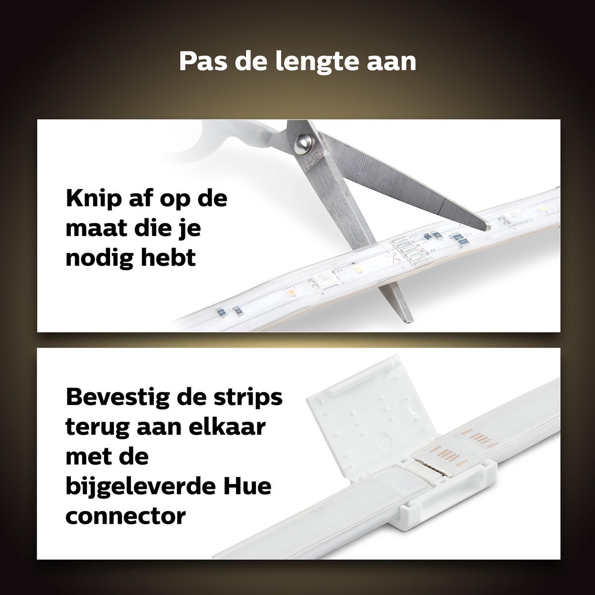 De V4-versie is geschikt om te inkorten én weer uit te breiden met verlengstukken (los verkrijgbaar). Je bedient de strip via Bluetooth in de Hue app of – nog slimmer – via een Hue Bridge, zodat je toegang krijgt tot automatiseringen, scènes, timers en bediening buitenshuis.