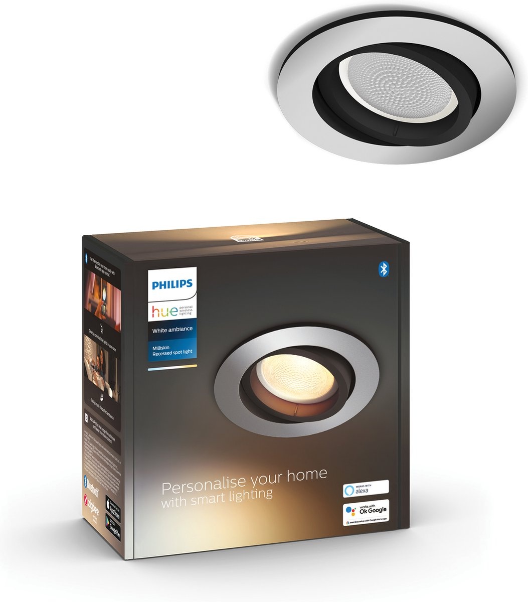 De Philips Hue Milliskin is een inbouwspot met een stijlvol aluminiumkleurig, rond ontwerp. Centraal bevindt zich een ronde, richtbare spot, omlijst door een karakteristieke zwarte rand. Deze White ambiance LED-lamp levert warm tot koelwit licht, dat je eenvoudig kunt dimmen en bedienen via Bluetooth met de Hue app op je tablet of smartphone. Wil je toegang tot alle functies, zoals geautomatiseerde timers en automatiseringen, verbind je de spot met een Philips Hue Bridge.