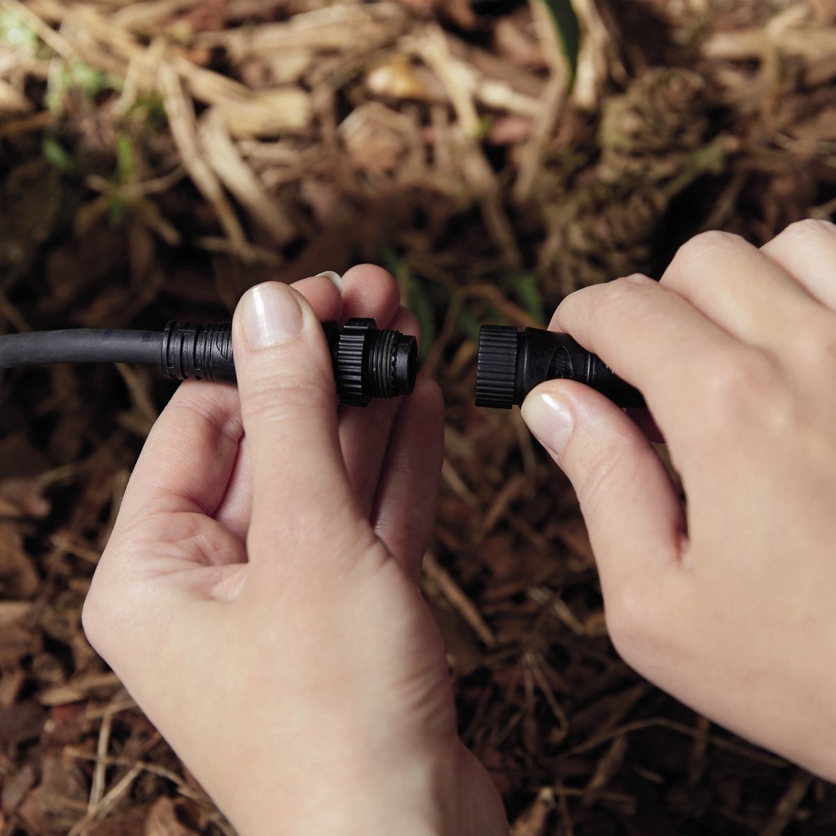 De verlengkabel is speciaal ontworpen voor het low-voltage Hue Outdoor systeem. Dankzij de spatwaterdichte connectoren klik je de kabel eenvoudig tussen de bestaande voeding en je Hue Outdoor armatuur. Zo breid je jouw smart tuinverlichting veilig en betrouwbaar uit, volledig geïntegreerd in je bestaande Hue installatie.