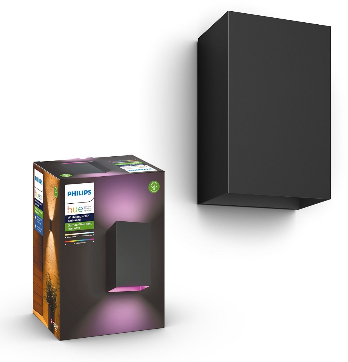 De Philips Hue Resonate muurlamp in zwarte uitvoering is een stijlvolle en slimme buitenlamp die zowel naar boven als naar beneden schijnt. Dankzij de White and Color Ambiance-technologie kun je kiezen uit miljoenen kleuren en diverse wittinten om jouw buitenruimte precies de sfeer te geven die je wenst – van warm wit tot koel daglicht of levendige kleuren.