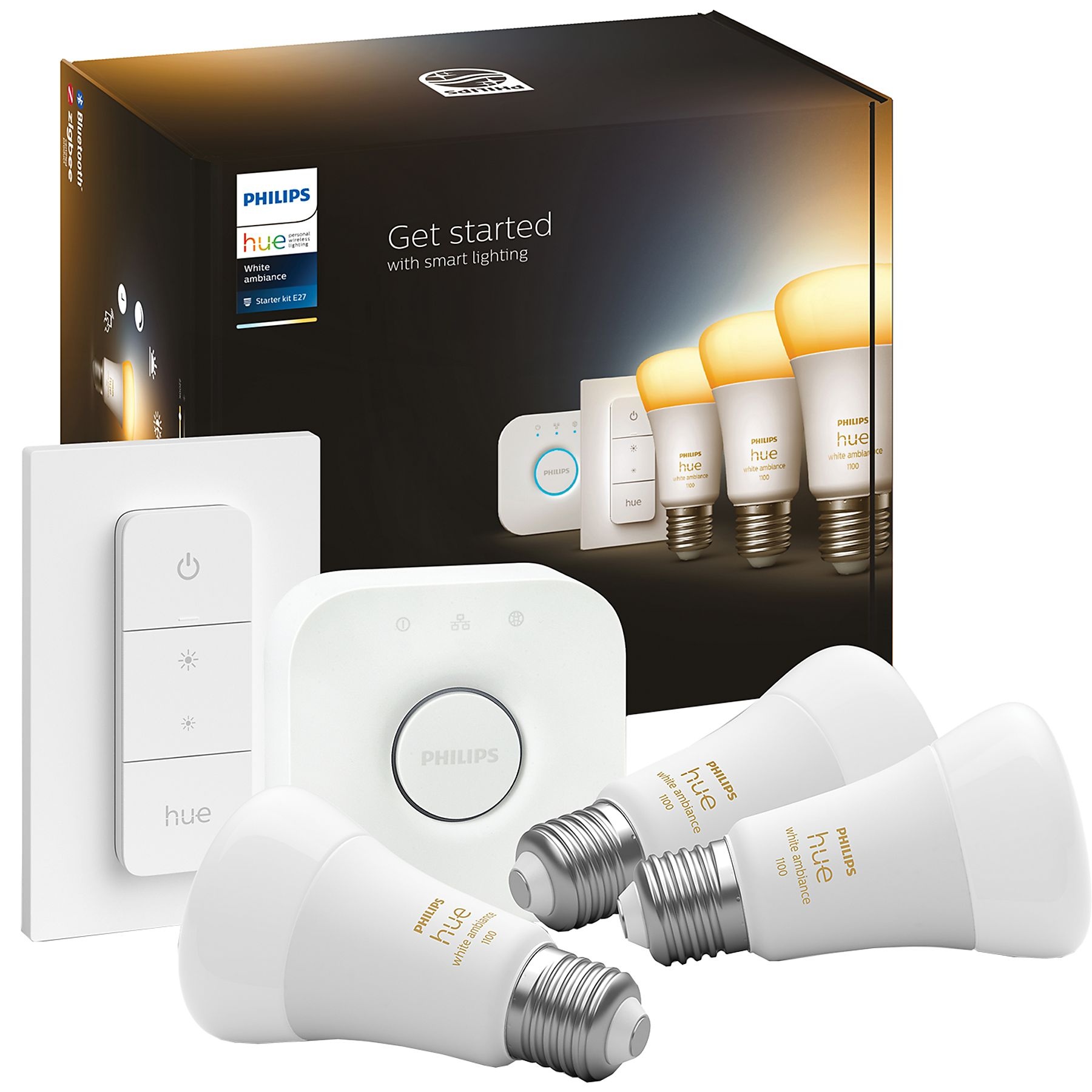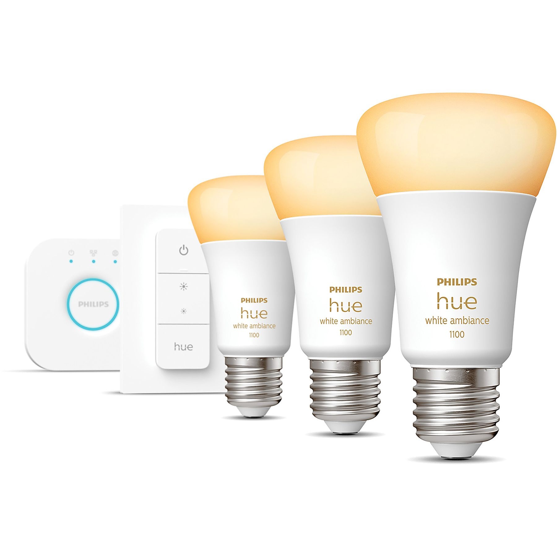 - Complete starterset met 3 E27 White Ambiance lampen, Hue Bridge en Dimmer Switch in één doos.