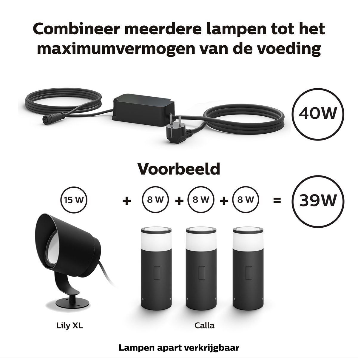| Maximaal vermogen | 40W totaal (voor Hue Outdoor low-voltage armaturen) |