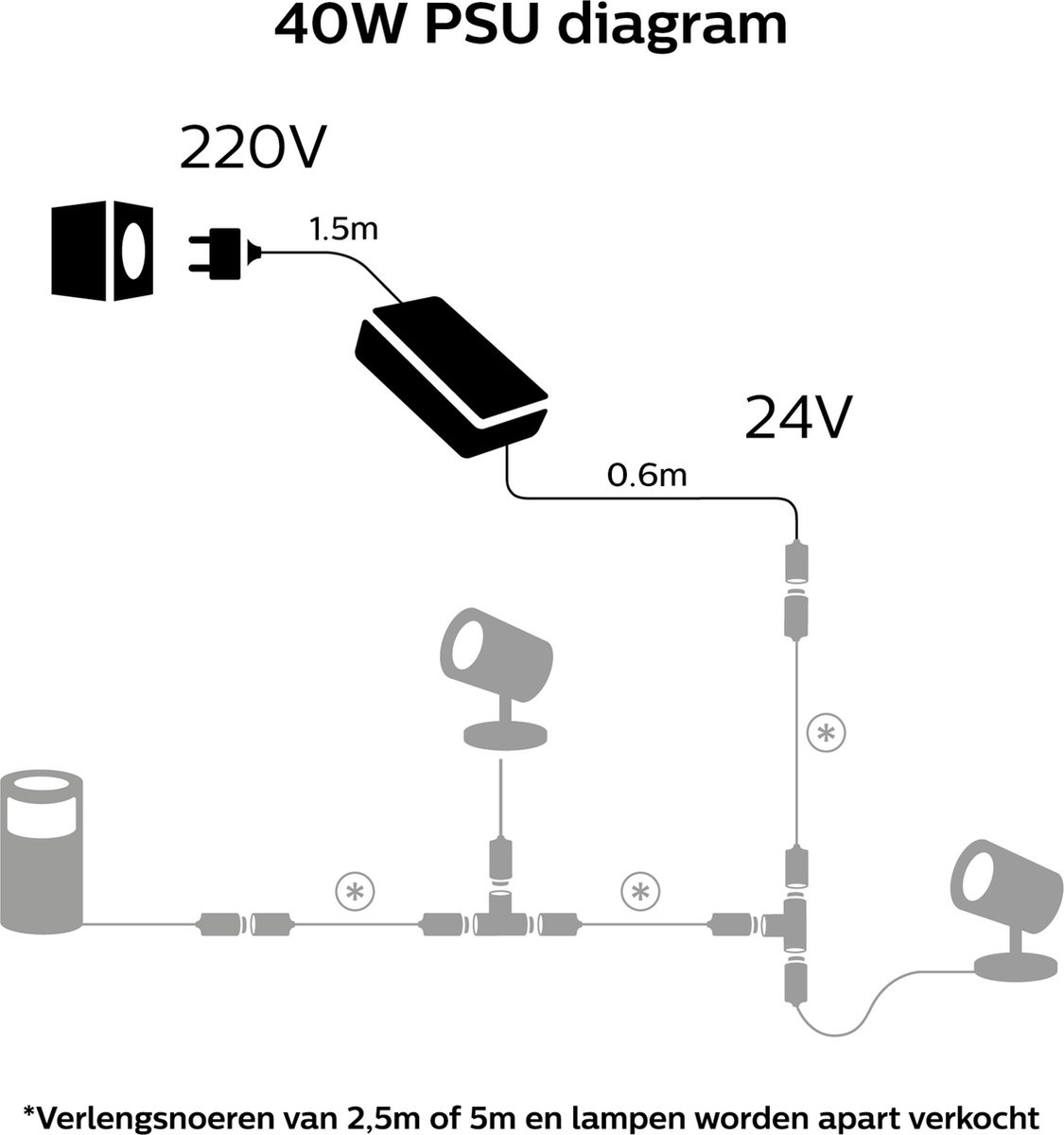 - Veelgemaakte fout: De 40W-voeding proberen te gebruiken met niet-Hue 230V-buitenverlichting. Deze voeding is uitsluitend bedoeld voor Hue low-voltage armaturen.