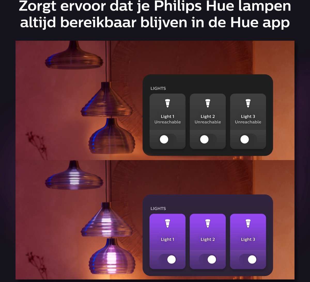 - Je Hue lampen blijven altijd onder spanning en bereikbaar in de app