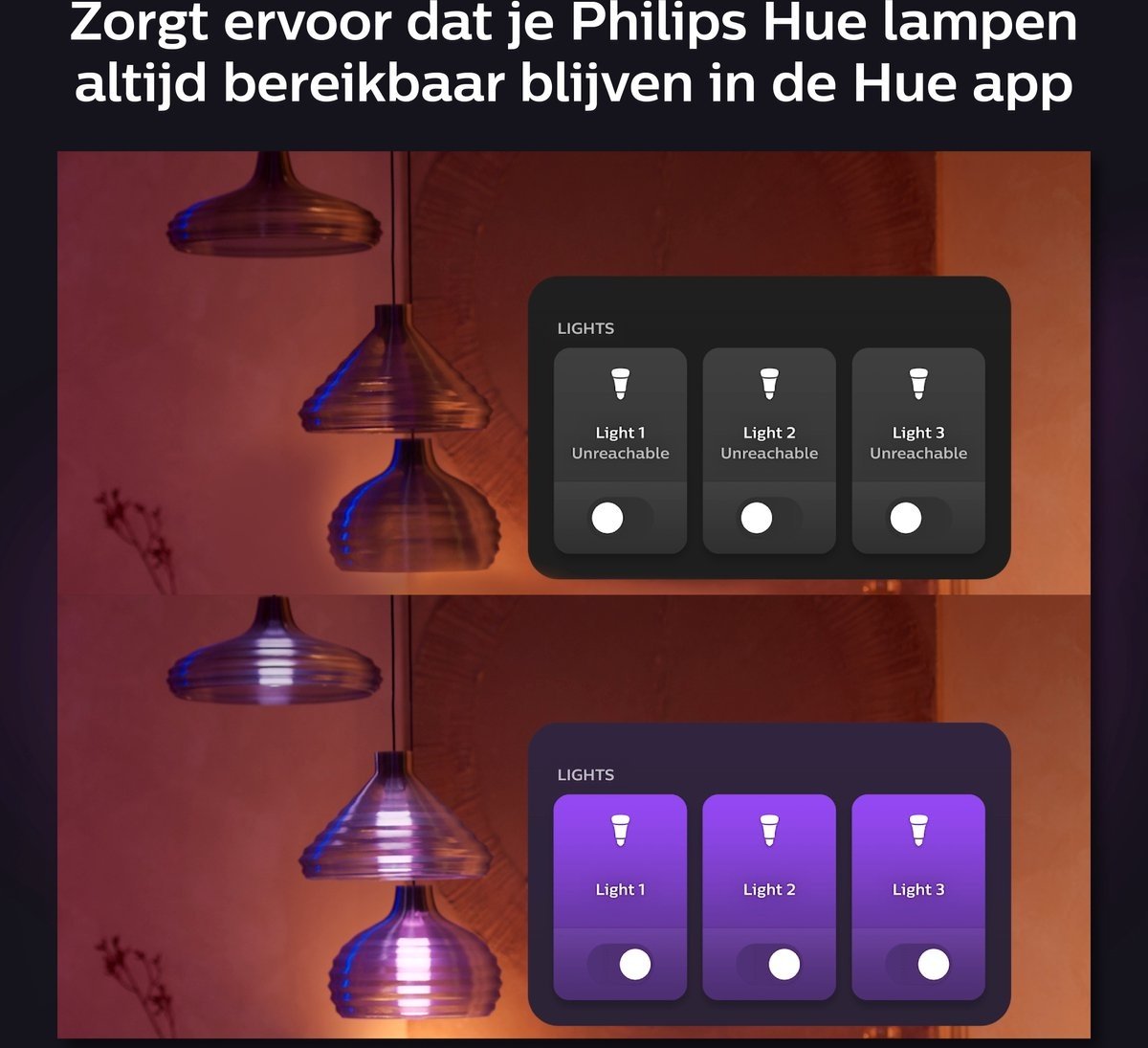 - Hue lampen blijven altijd onder spanning – nooit meer “offline” lampen