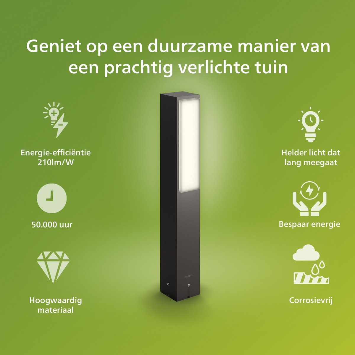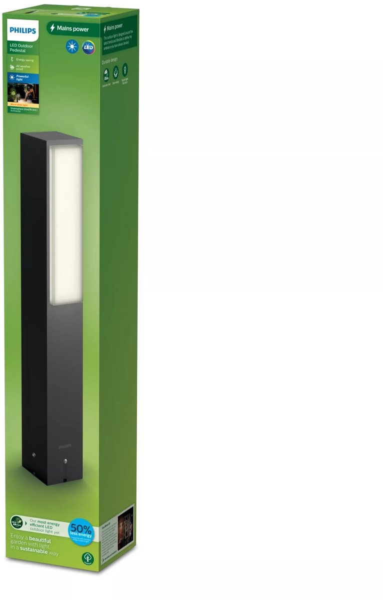 Geef je pad, oprit of tuin direct een stijlvolle upgrade met de Philips MyGarden Stratosphere sokkellamp (77 cm). De geïntegreerde LED 3.8W levert warmwit 2700K licht met een krachtige lichtpool (ca. 800 lumen) en is onderdeel van Philips’ Ultra Efficient lijn: duurzaam, energiezuinig en met een zeer lange levensduur. De behuizing in antraciet gegoten aluminium is weerbestendig (IP44) en blijft mooi in weer en wind.