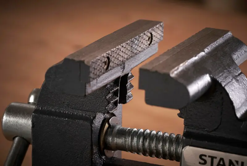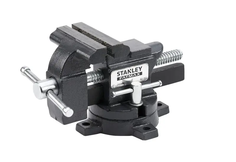 Robuuste Stanley MaxSteel bankschroef met bekbreedte 100 mm en bekopening ca. 85 mm, geschikt voor een maximale klemdruk van circa 1100 kg. Ideaal voor in de werkplaats of garage bij zagen, vijlen, boren en montagewerk.